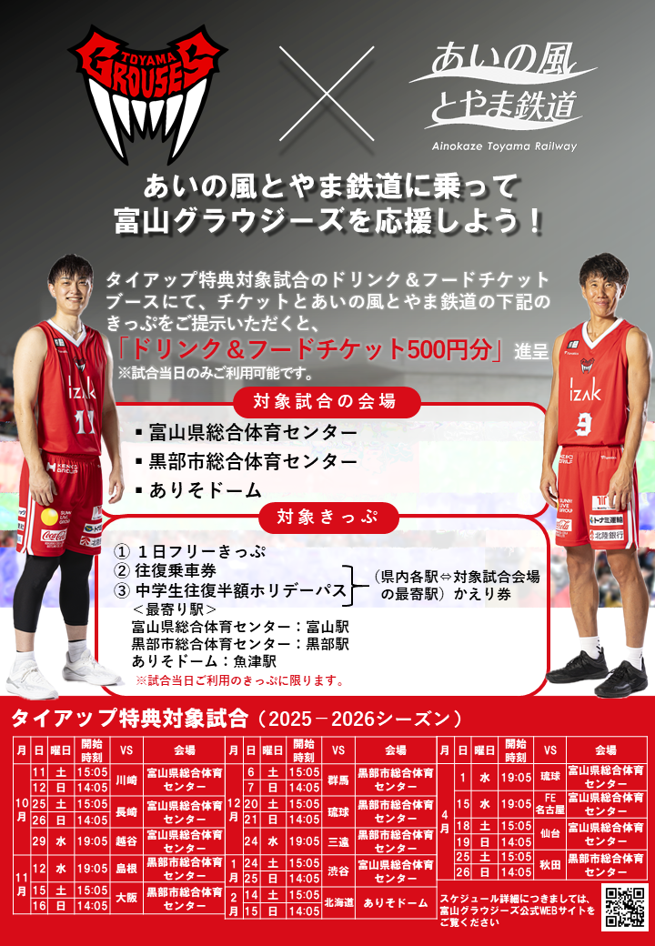 富山グラウジーズ | Bリーグ(バスケットボール) | 富山駅、魚津駅、黒部駅 |