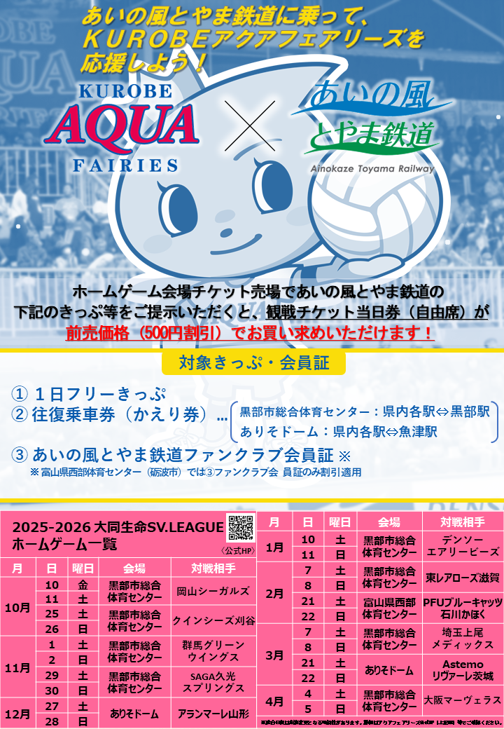 あいの風とやま鉄道では、富山県内の5つのプロスポーツチームとタイアップを行っております。