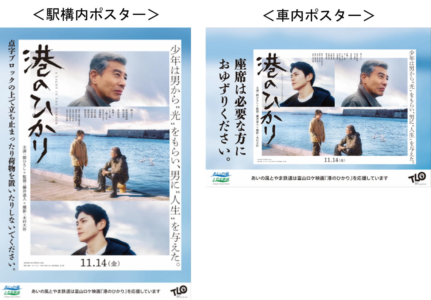 富山県内で撮影が行われた映画「港のひかり」の公開(11/14公開)を記念して、富山県及び映画「港のひかり」とタイアップし、コラボポスターの掲出や、主演の舘ひろしさんによる車内アナウンスを行います。